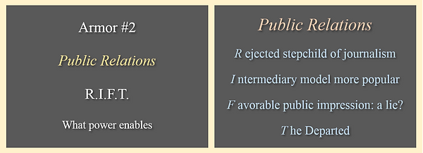 Through her complex interplay with her gaming systems, Auriane has constructed a set of qualities common to most first- and third-person shooters, in five categories: weapons; mind tools; armor components; health augments; and powerups. Auriane knows that these are not just qualities of the heroes of shooters, but also of those who triumph in the realm of external organizational communication (public relations, advertising, marketing, and sales). Below are the seventeen resources.